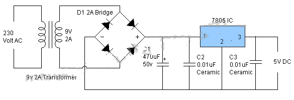 منبع تغذیه 5 ولت قطعات : ترانس 220 به 9 ولت دو آمپر دو سر - پل دیود دو آمپر یا چهار عدد دیود 1N4001 - خازن 470 میکروفاراد پنجاه ولت - خازن یک صدم میکرو فاراد سرامیک دو عدد - آی سی 7805